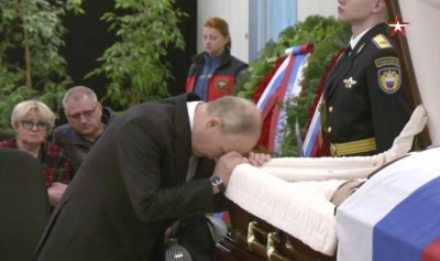 Putin şi-a sprijinit de două ori capul pe sicriul deschis al lui Evgheni Zinichev, fostă gardă personală şi agent KGB. El s-a aşezat apoi alături de soţia ministrului, Natalia şi de fiul acestora, Denis la ceremonia de înmormântare.