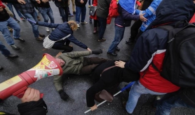 O parte dintre protestatarii aflaţi în Piaţa Victoriei au intrat în conflict cu angajaţii Primăriei Capitalei care amenajează târgul de sărbători, au împins gardurile de protecţie şi au încercat să intre pe partea carosabilă, a declarat purtătorul de cuvânt al Jandarmeriei, Georgian Enache.