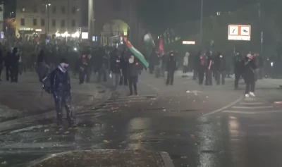 Manifestanţii violenţi au aruncat cu o serie de obiecte - sticle, pietre, chiar şi unele semne de circulaţie rupte - la care poliţia anti-revoltă a răspuns activând tunurile cu apă. Manifestanţii violenţi nu au reuşit să treacă de bariera poliţiei anti-revoltă, dar ciocnirile au continuat.