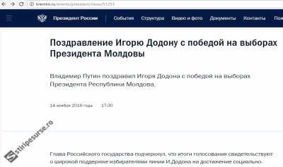 "Liderul de la Kremlin a ţinut să sublinieze că rezultatele votului exprimat de cetăţenii Republicii Moldova este o confirmare că aceştia susţin mesajul şi politica promovate de Igor Dodon, privind edificarea unei stabilităţi social-economice în ţara lor, dar şi priorităţile sale echilibrate în politica externă a ţării. Preşedintele Rusiei s-a arătat dispus pentru un dialog constructiv şi colaborare activă la nivel bilateral, pentru dezvoltarea relaţiilor moldo-ruse în conformitate cu prevederile Acordului de prietenie şi colaborare, de la semnarea căruia se fac a 15 ani", se arată în comunicatul de pe pagina kremlin.ru.