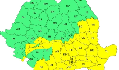During the day, mixed precipitation (rain, sleet and snow) will occur in Oltenia and Muntenia, rain in Dobrogea and snowfall in Moldova, while snowfall will prevail overnight. Precipitation amounts of 25-30 litres per square metre are expected, with isolated totals exceeding 40 litres per square metre. Snow cover is forecast to reach an average depth of 10-30 cm, while wind gusts will reach 50-70 km/h, causing blizzard conditions and reducing visibility to below 100 metres.